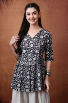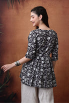 - Embrace the wrap-style top featuring a graceful V-neckline and side-button opening that flatters every curve, accentuated by intricate white floral motifs printed by hand.