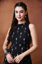 • Crafted in 100% cotton Ikat, sleeveless and high round neck. Like all our dresses, this jumpsuit too comes with pockets.