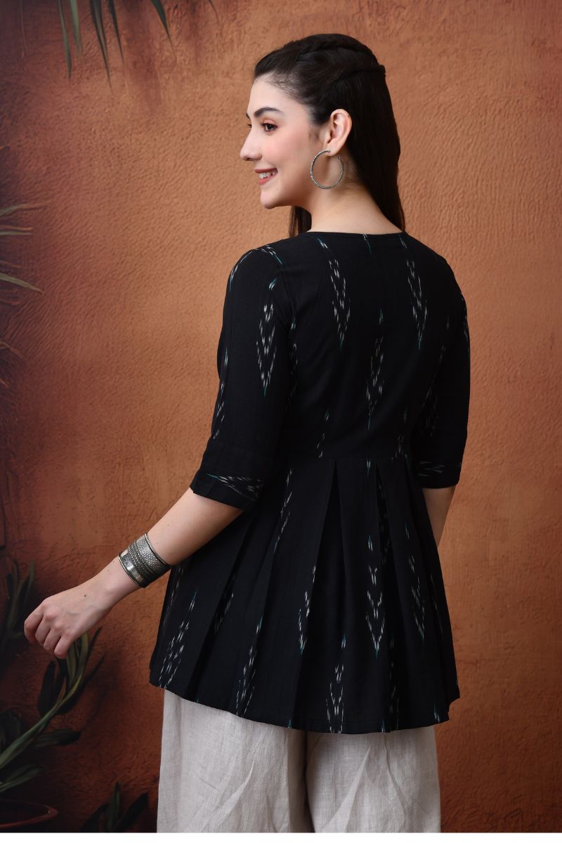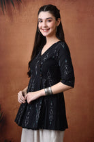 - Embrace the wrap-style top featuring a graceful V-neckline and side-button opening that flatters every curve, accentuated by intricate white Ikat motifs weaved by hand.