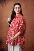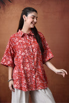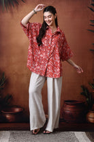 - Embrace the relaxed silhouette, featuring a collared neckline and half sleeves, adorned with intricate floral motifs in vibrant red hues, Crafted in 100% cotton, this shirt brings together comfort and contemporary charm.
