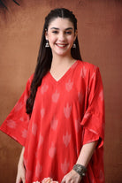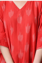 - Crafted in soft handwoven cotton ikat, this Red Cowl Dress redefines everyday ease with artisanal charm.