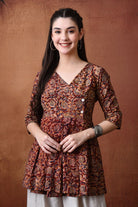 • Embrace the wrap-style top featuring a graceful V-neckline and side-button opening that flatters every curve, accentuated by intricate floral kalamkari motifs printed by hand.