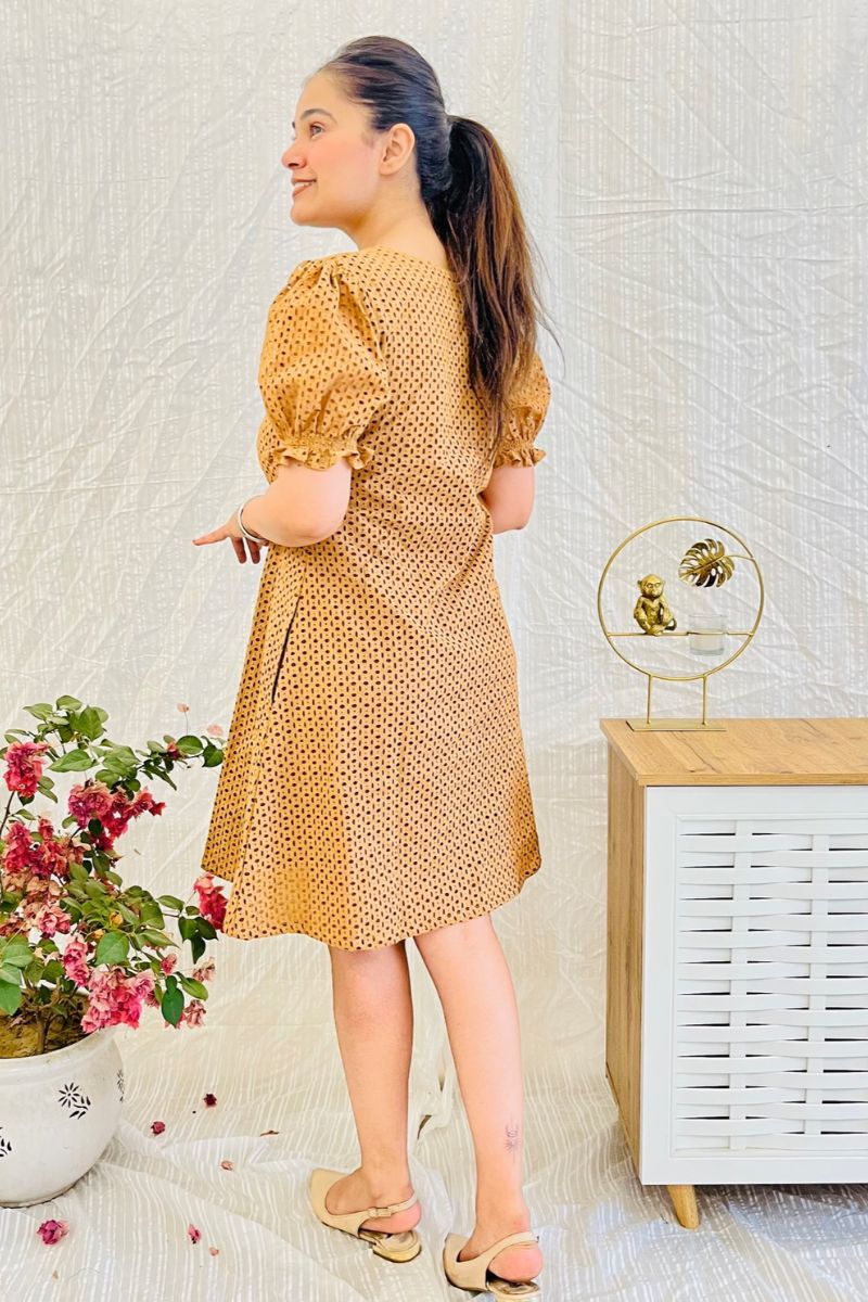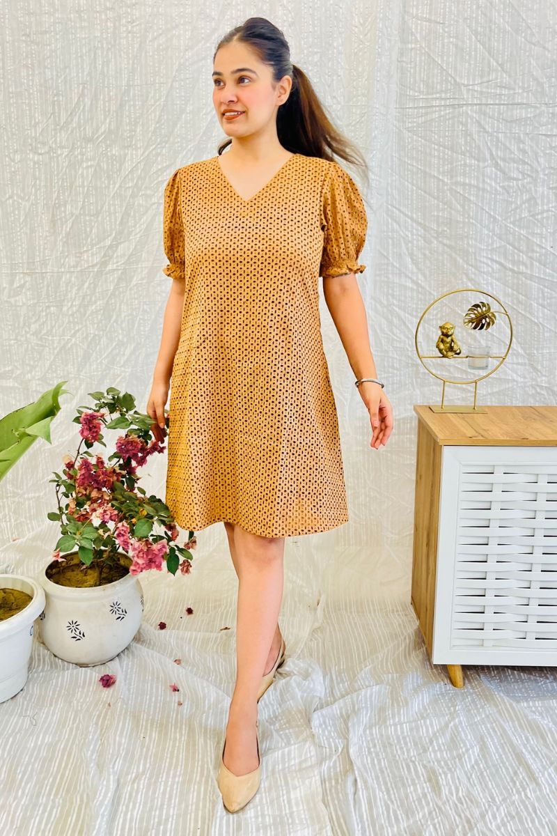 - Crafted in 100% cotton, the dress comes with a V-neck and flare grazing the knees.