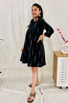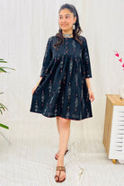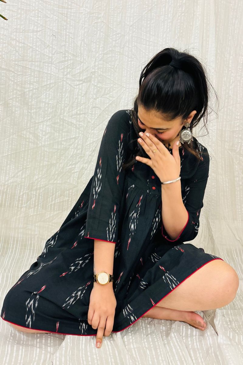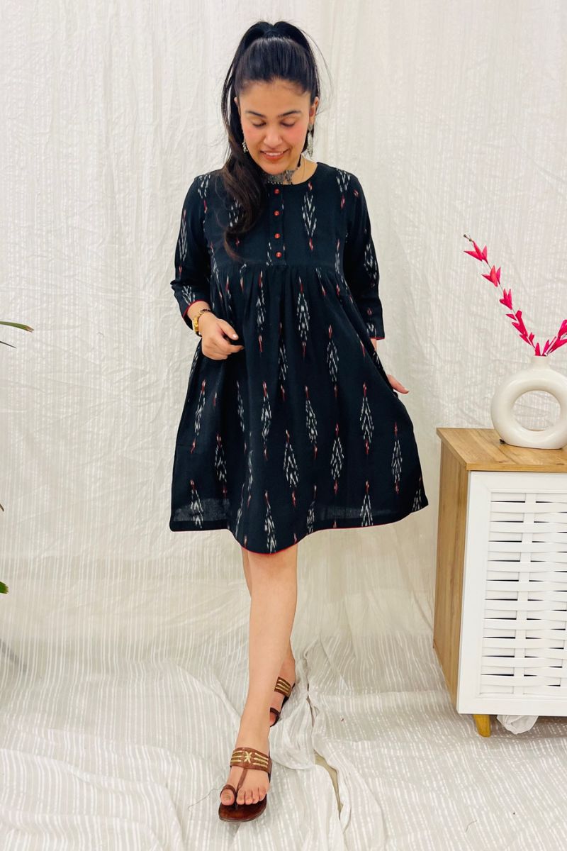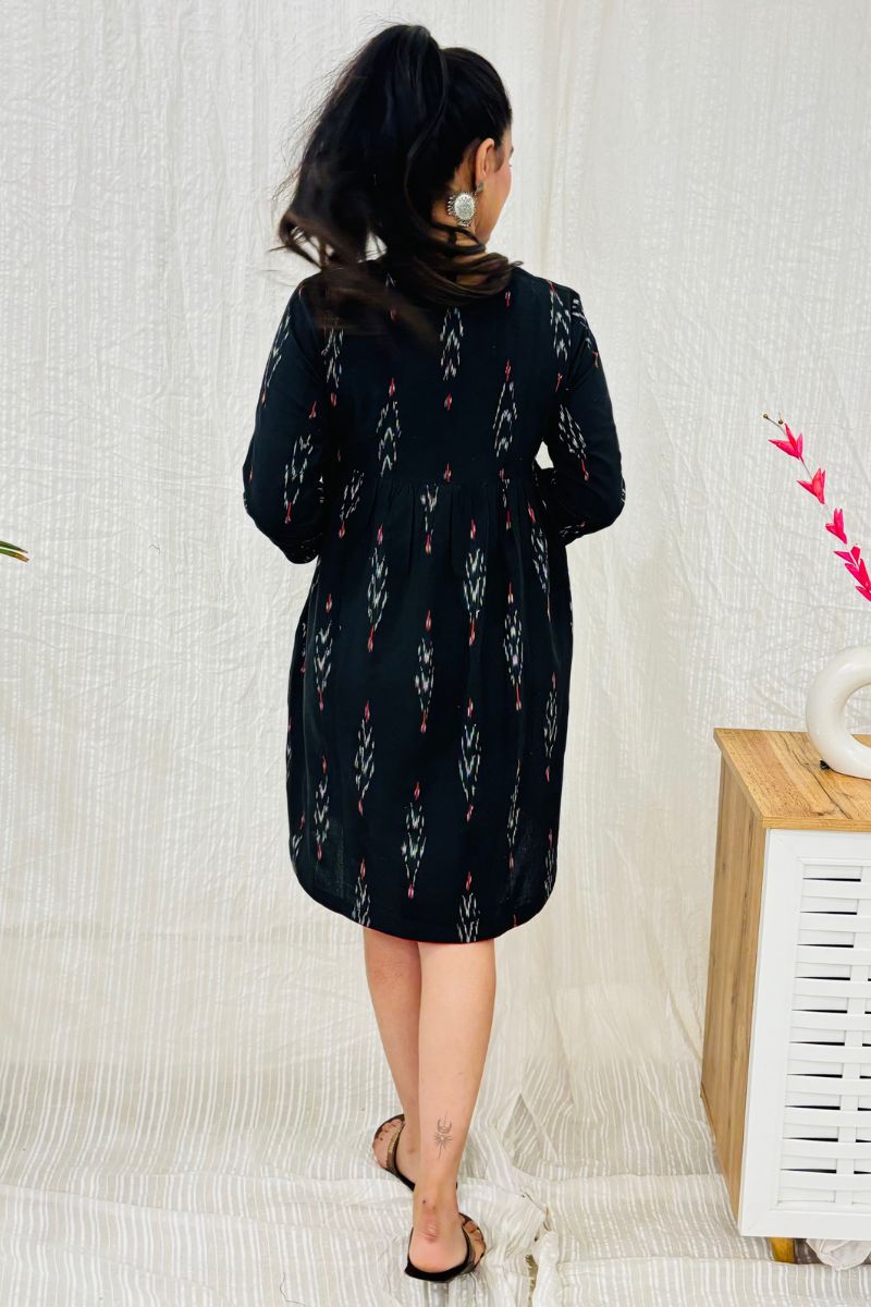 - Experience chic sophistication with our Black Ikat Flared Dress – a timeless ensemble that seamlessly blends style and grace.