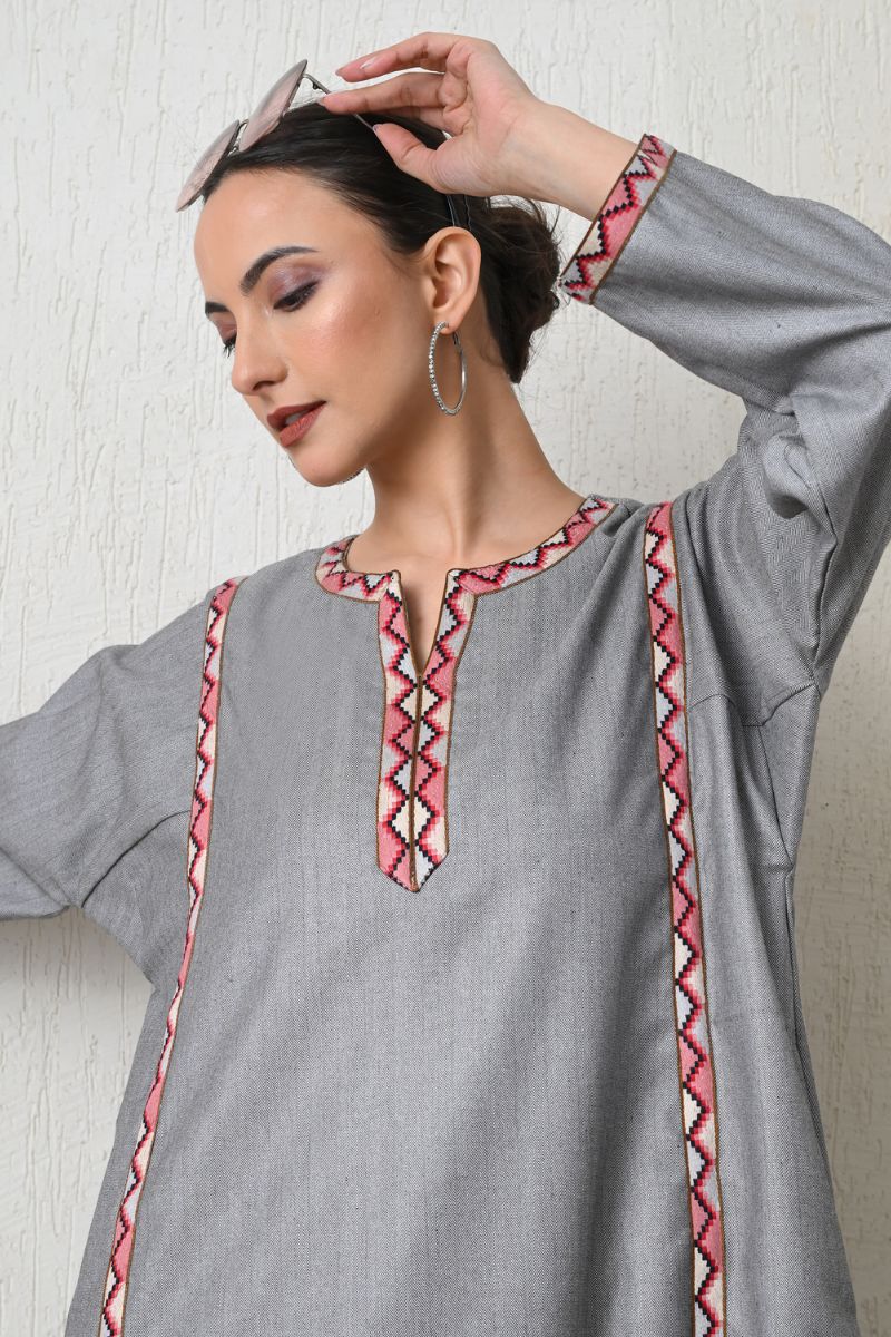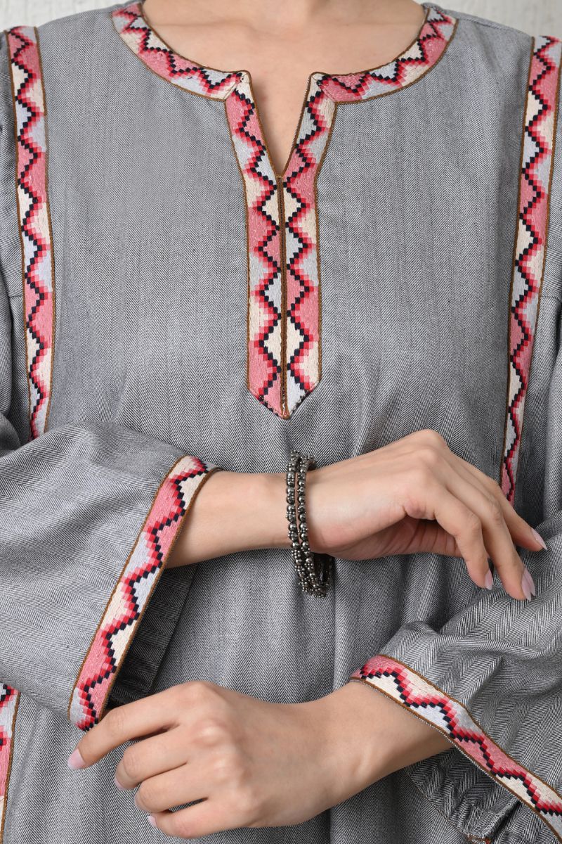 - Elegant as mist settling over Gulmarg meadows, Fizza embodies understated luxury through its refined phiran silhouette and subtle contrast lacework accents.