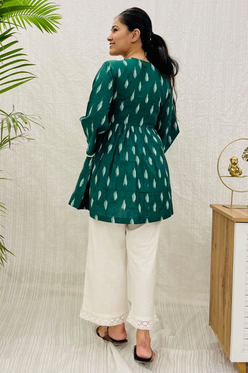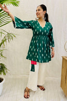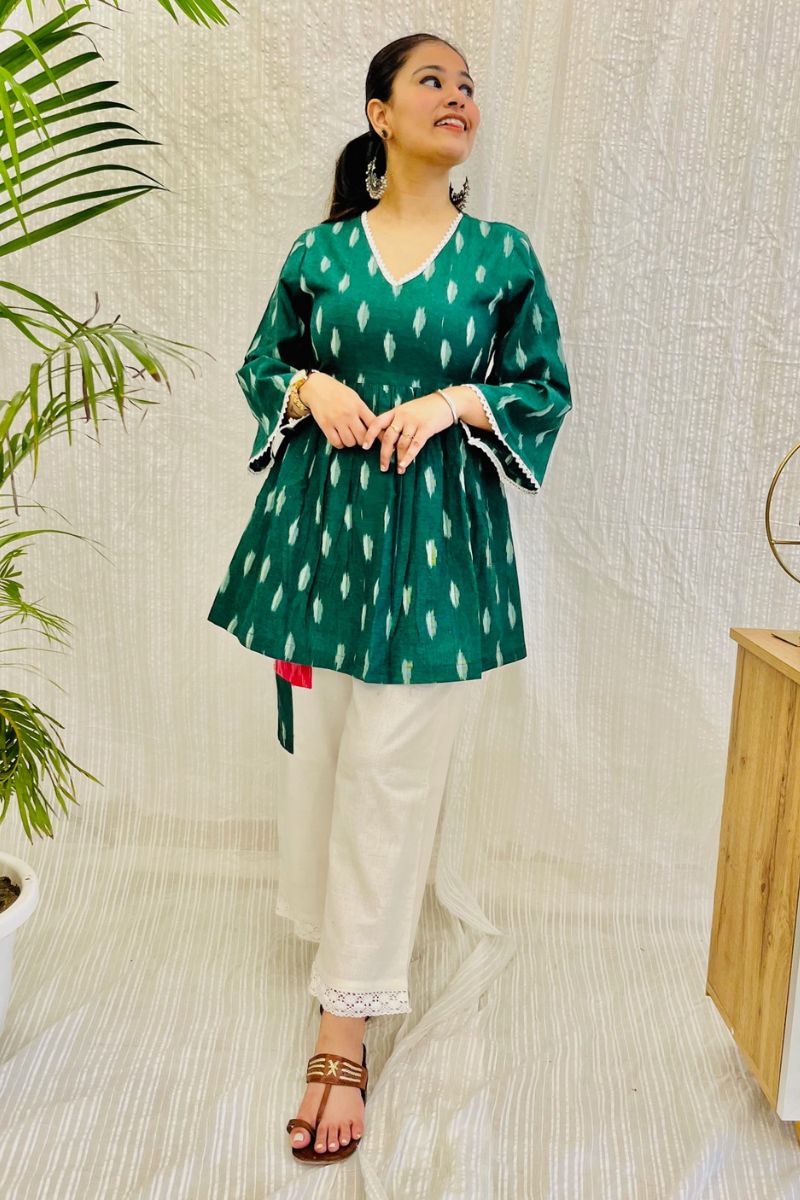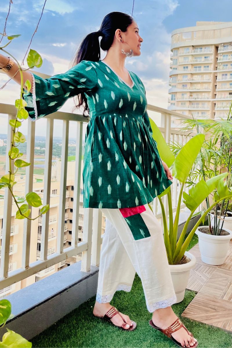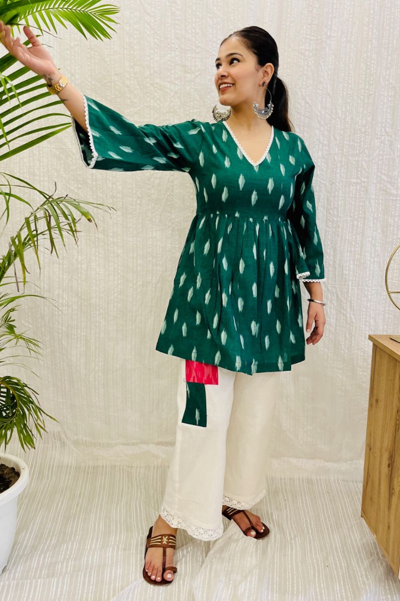 - Discover sophistication with our Green Ikat Co-ord Set. Indulge in the captivating charm of bottle green ikat with lace detail.