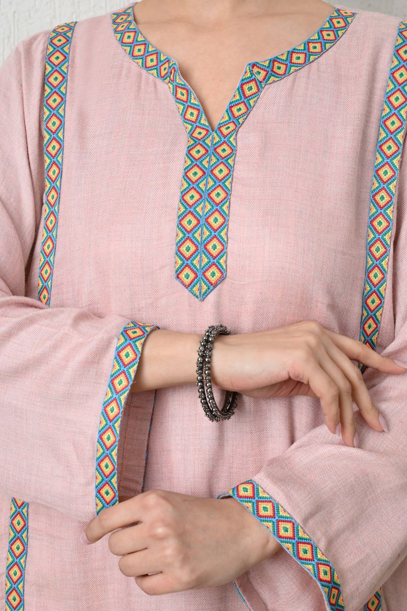 - Soft as the first dew on spring blossoms, Rumi reimagines the beloved phiran in a tender blush hue kissed with feminine contrast lace detailing.