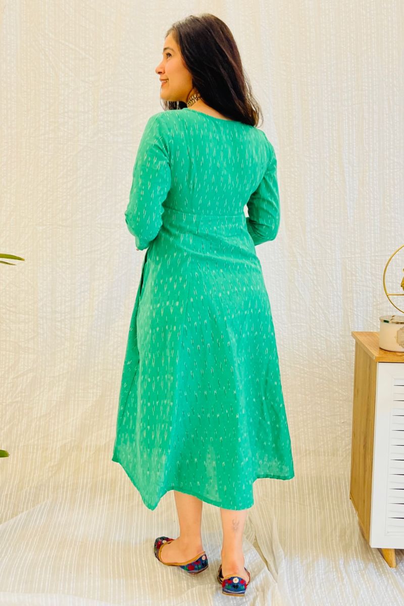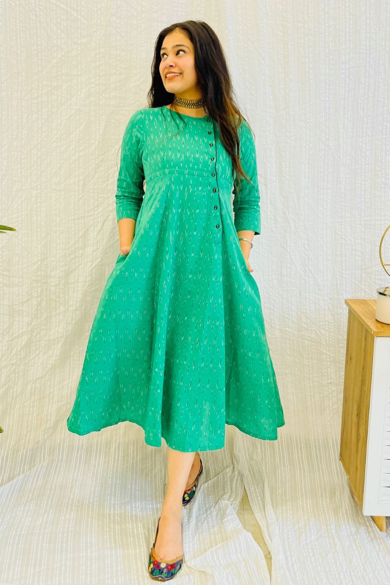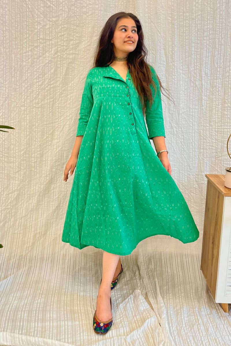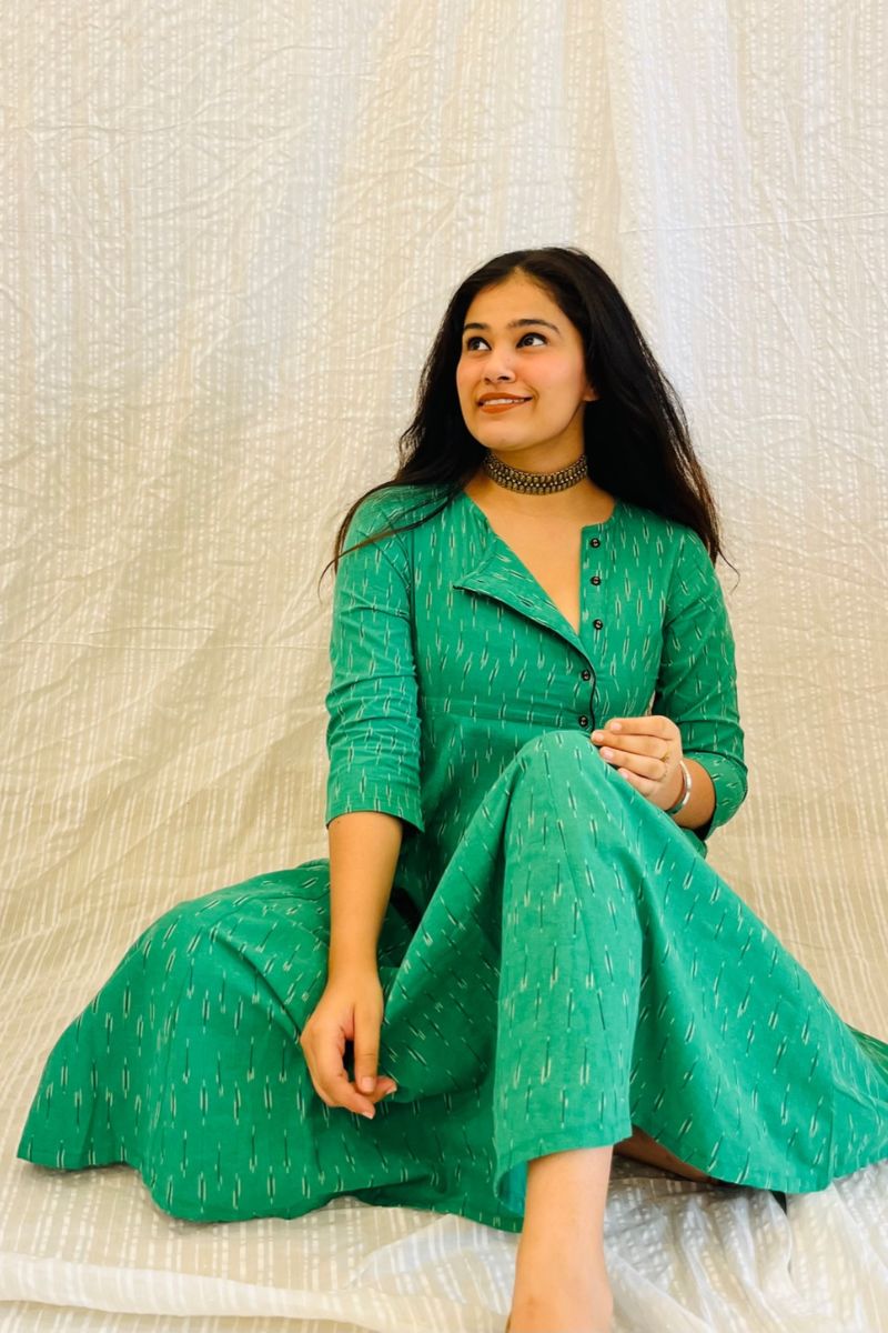 - Crafted in 100% cotton Ikat, with a contrast detailing on neck and buttons of the dress.