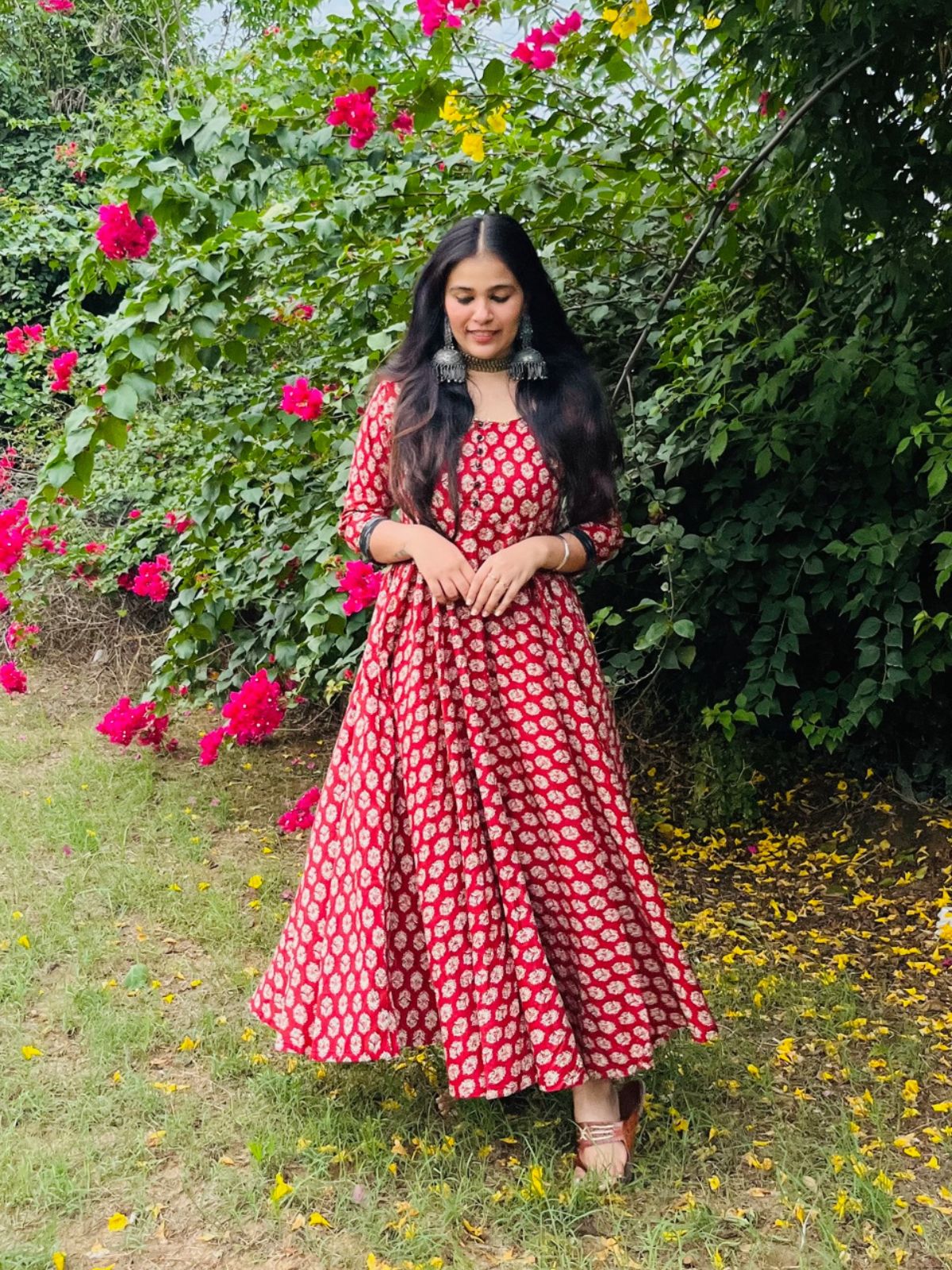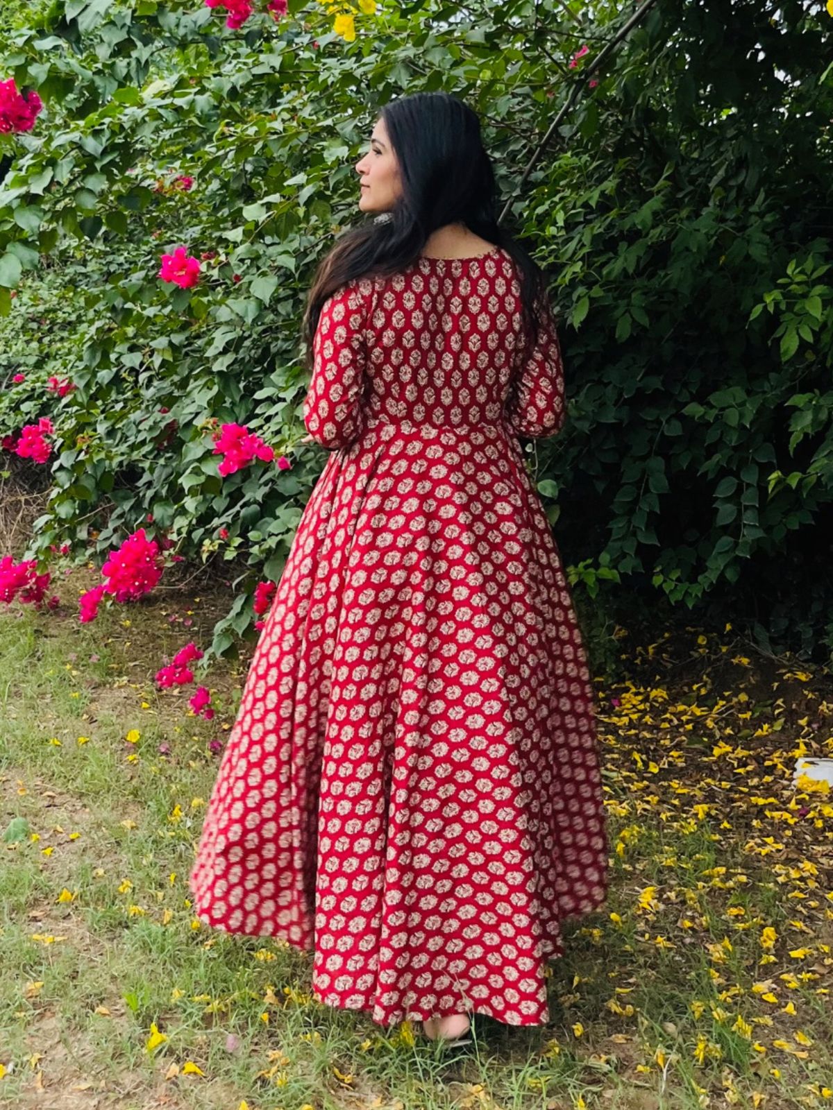 - Crafted in 100% cotton with rustic-hued block print motifs, it’s finished with a round neckline, delicate gota detailing, and fabric buttons on the yoke for a timeless handcrafted charm..