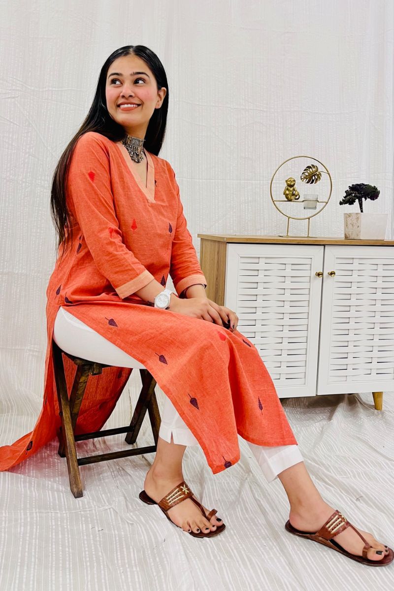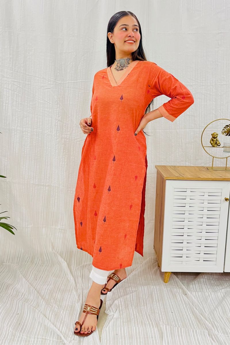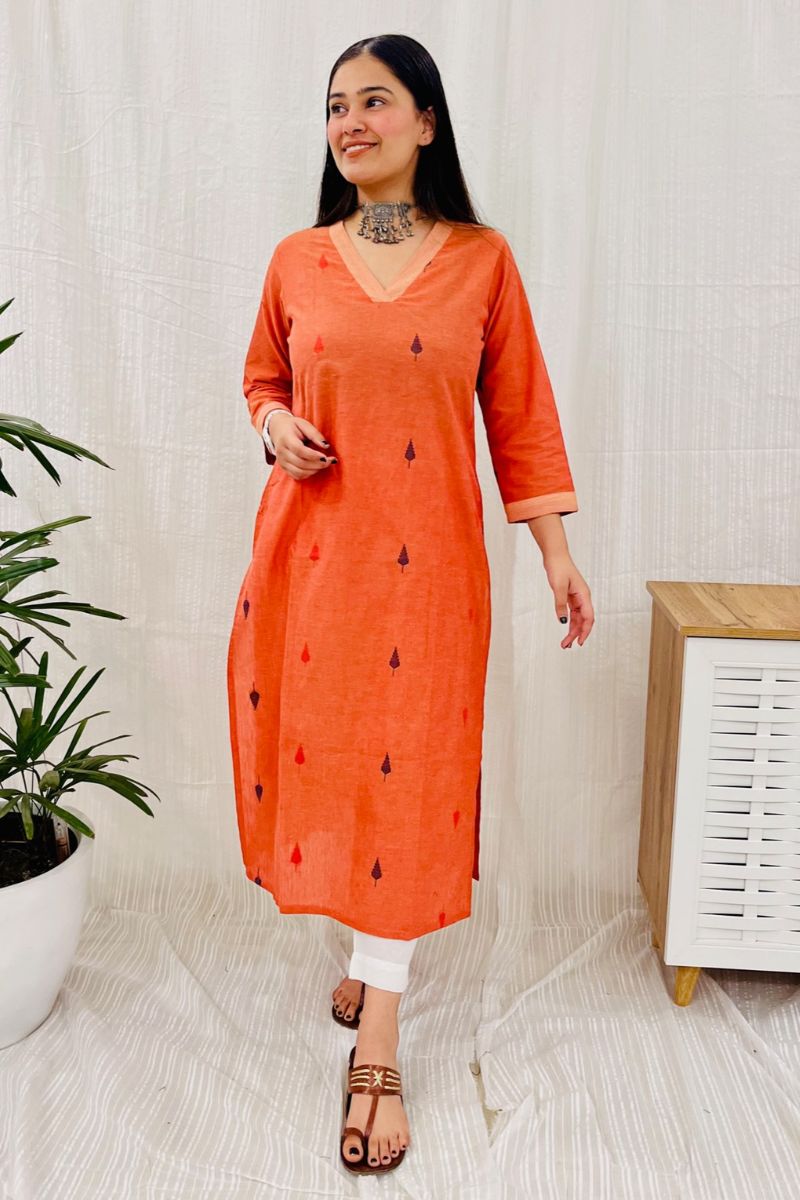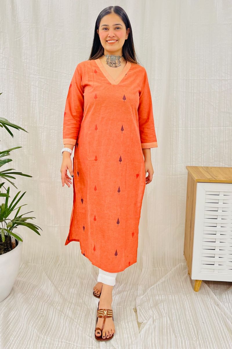 - Crafted in 100% cotton, this kurta is adorned with a smart and stylish V-neck and is framed with three-quarter-length sleeves, enhanced with contrast banded cuffs