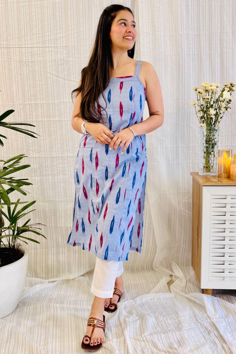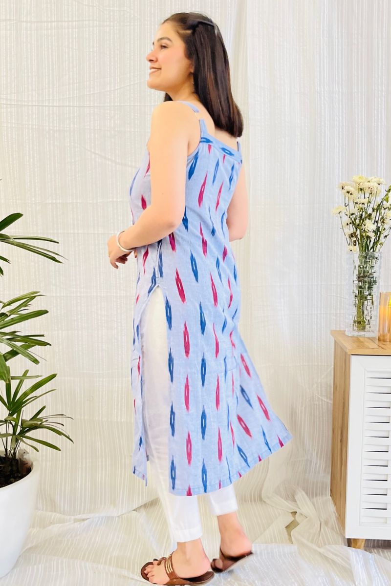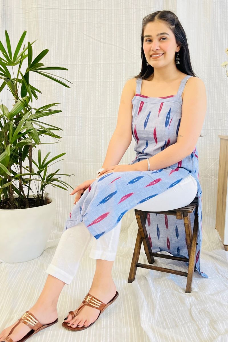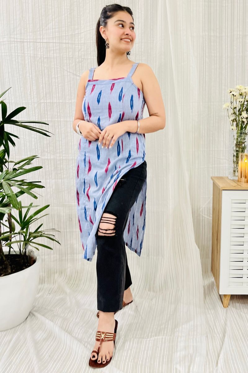 • This elegant strappy sleeveless kurta has been crafted in woven ikat and is topped with a square neck and enhanced with side slits, perfect for office or on a casual outing with friends.