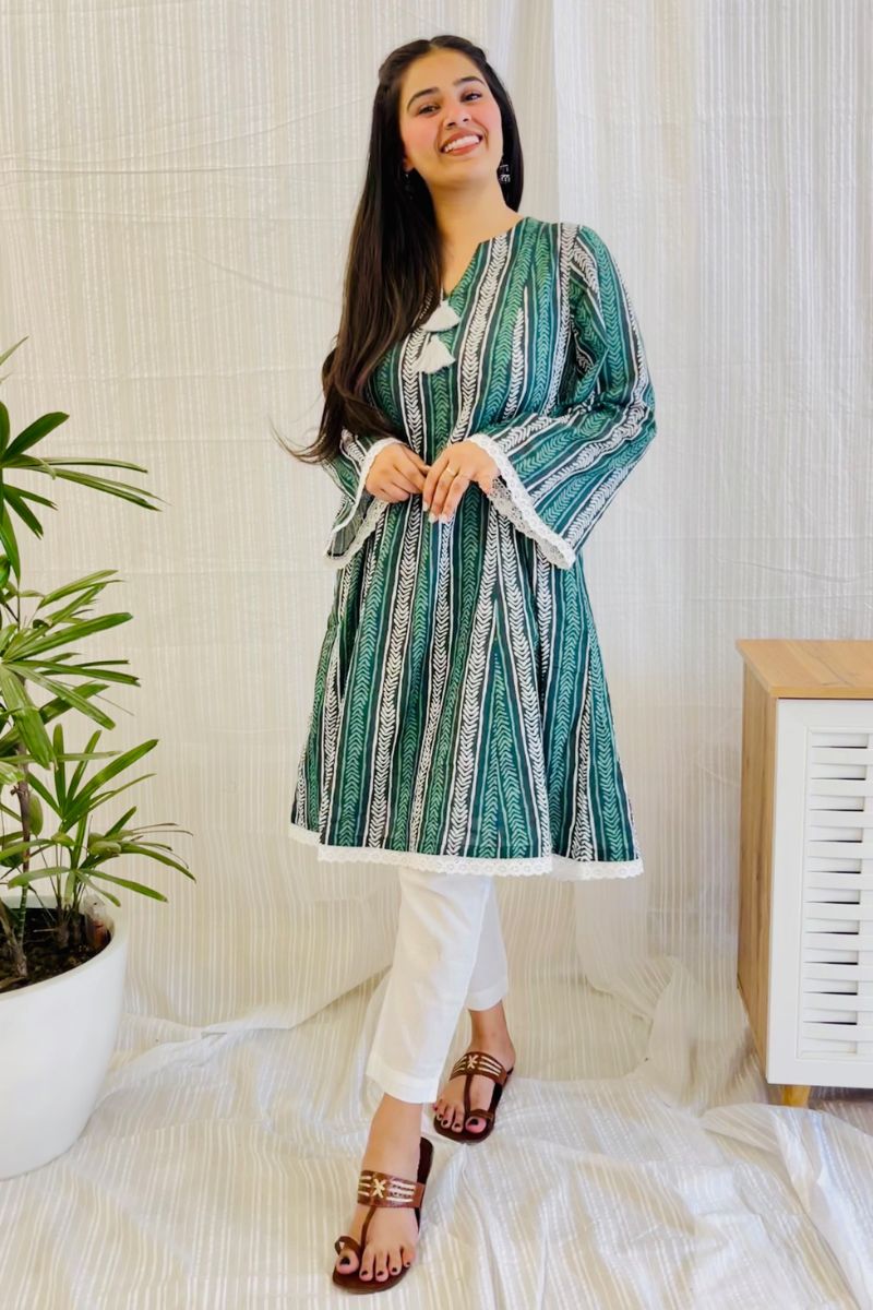 - This block-print beauty with flared sleeves is sure to make you feel gorgeous, you can style this with any solid pants or jeans and a pair of sandals, perfect for office or wearing on a casual outing with friends.