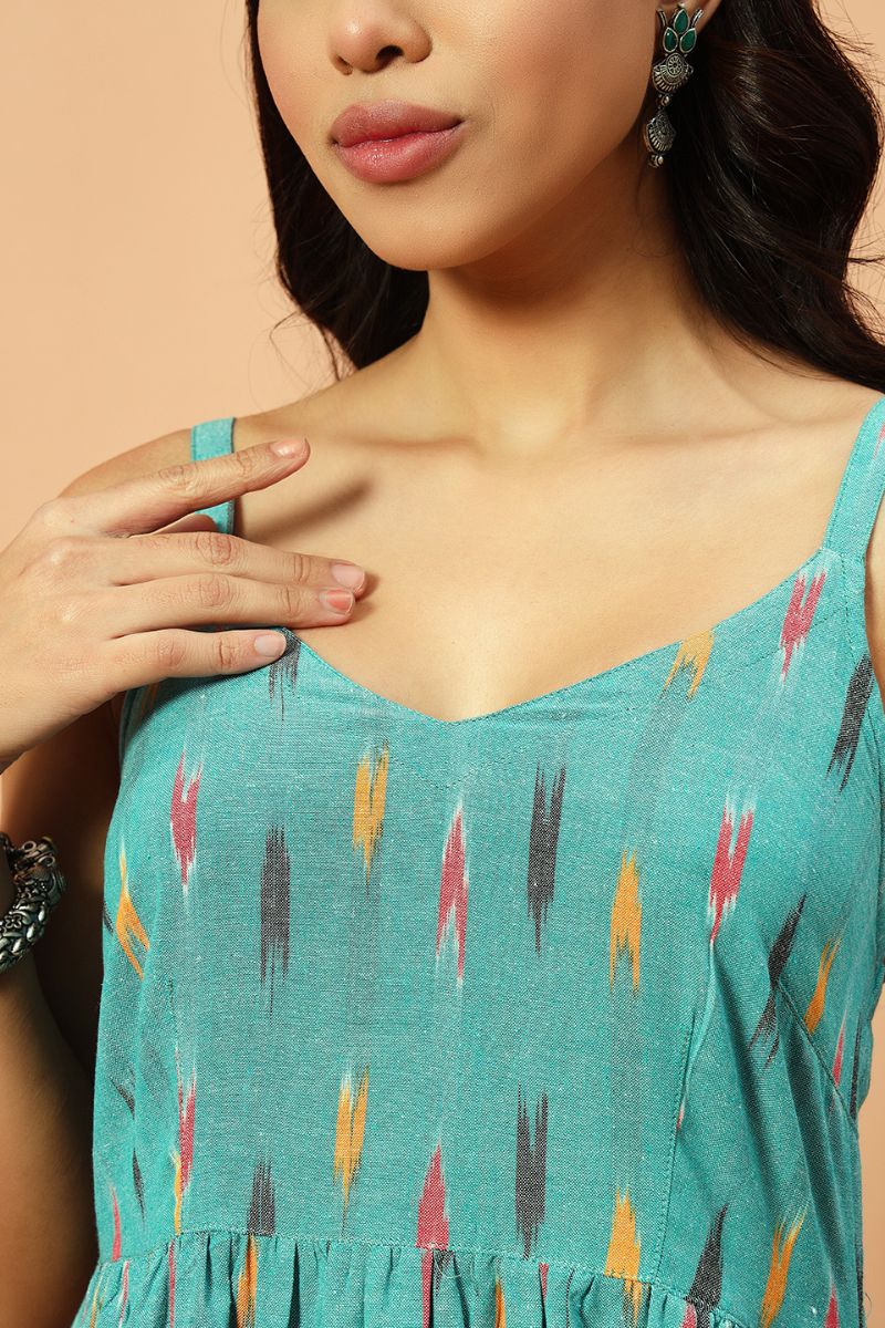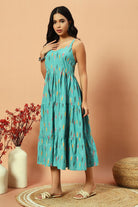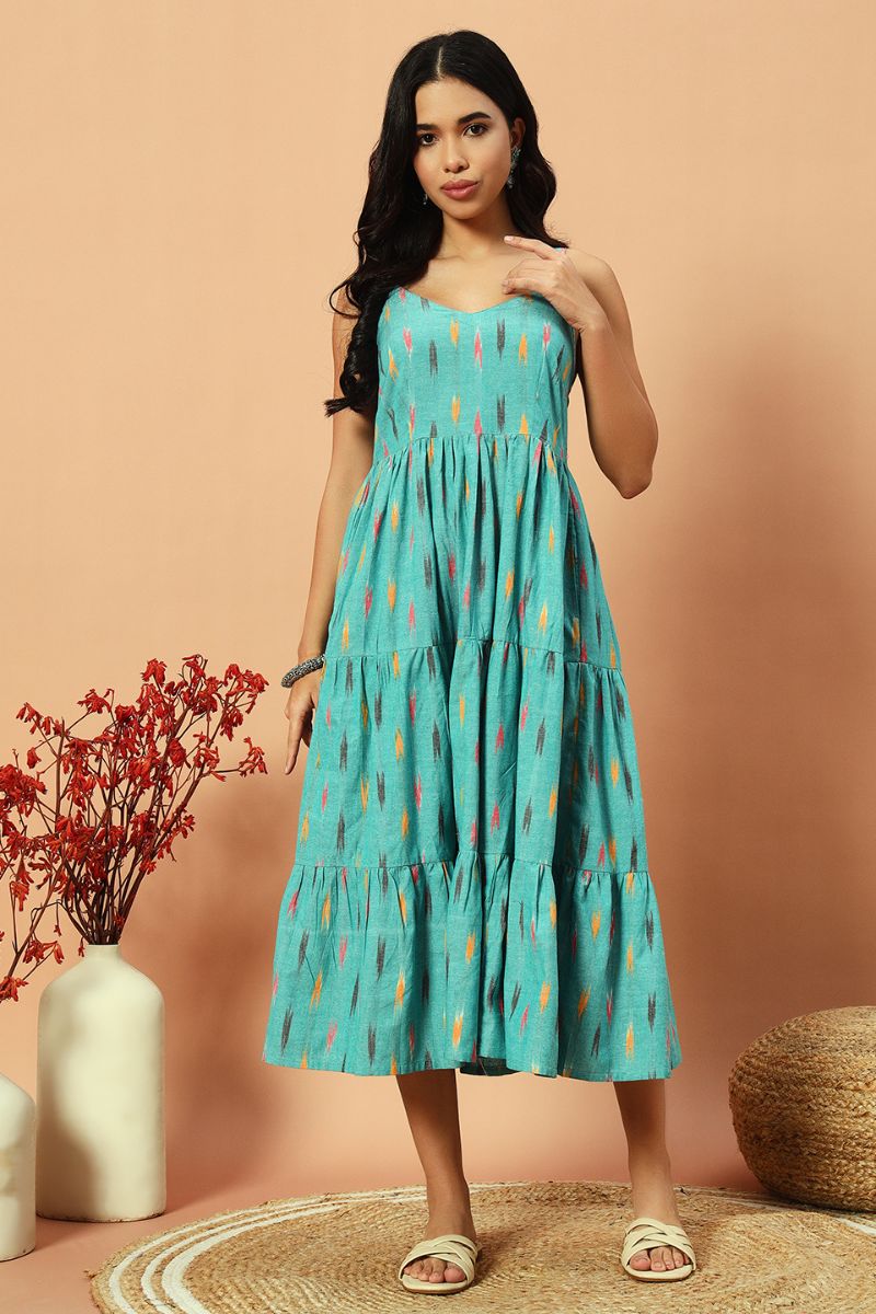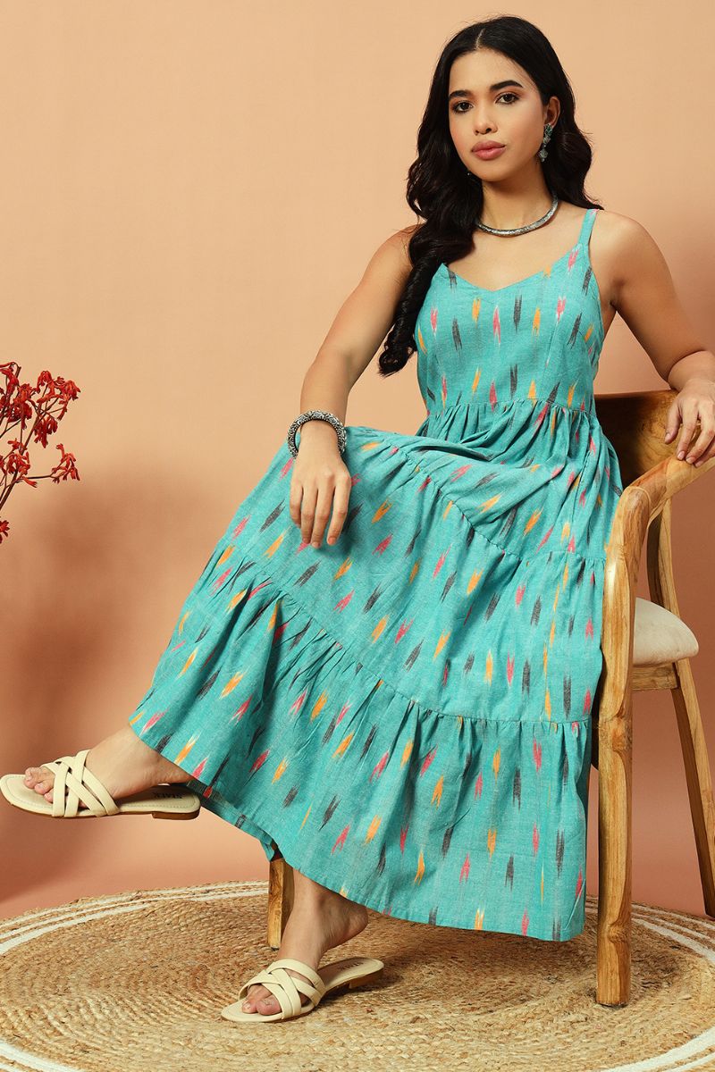- Frills, ikat fabric and flowy silhouette makes this dress uber cool and classy calf length for a day out.