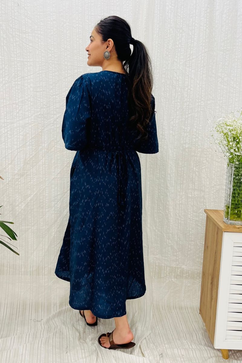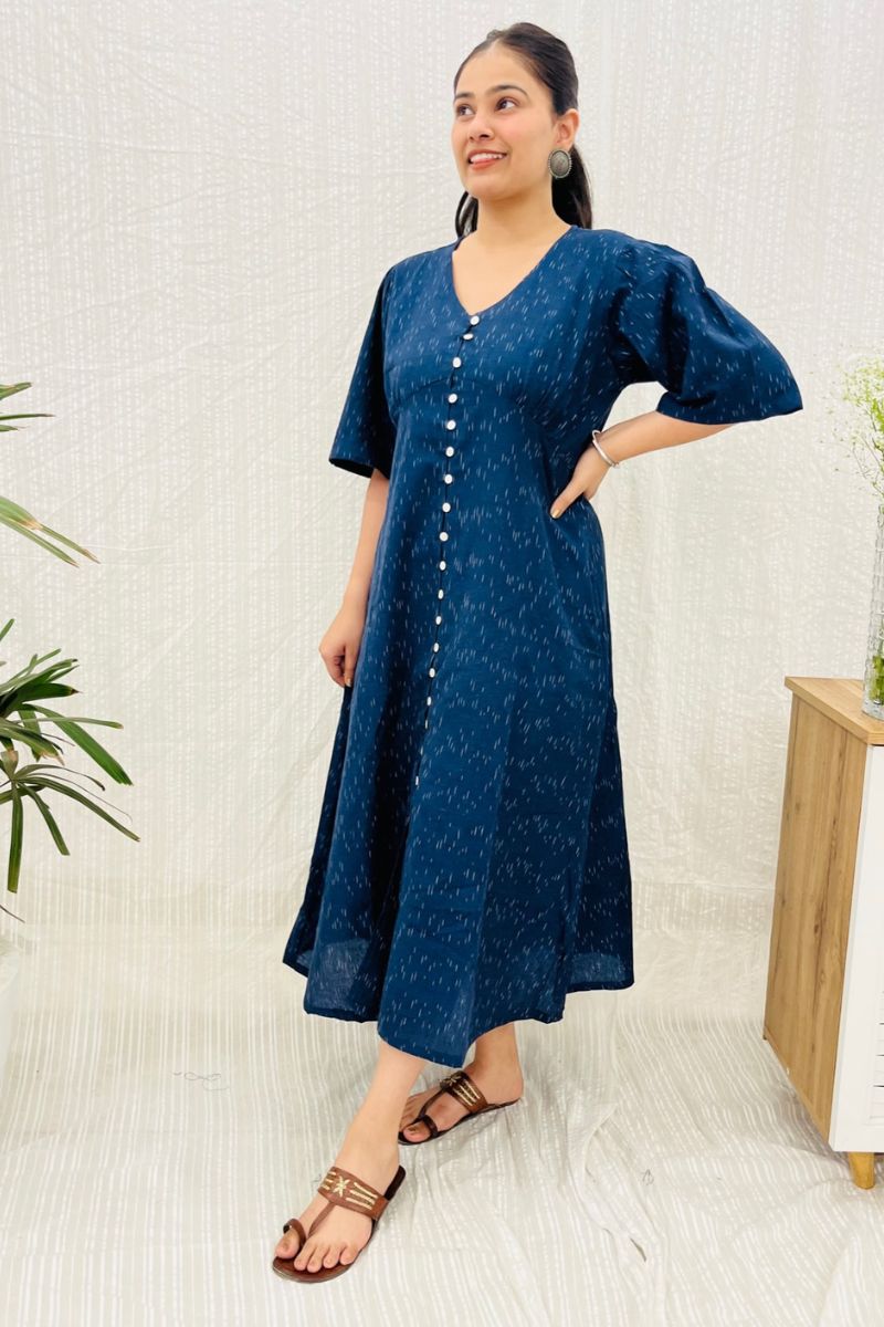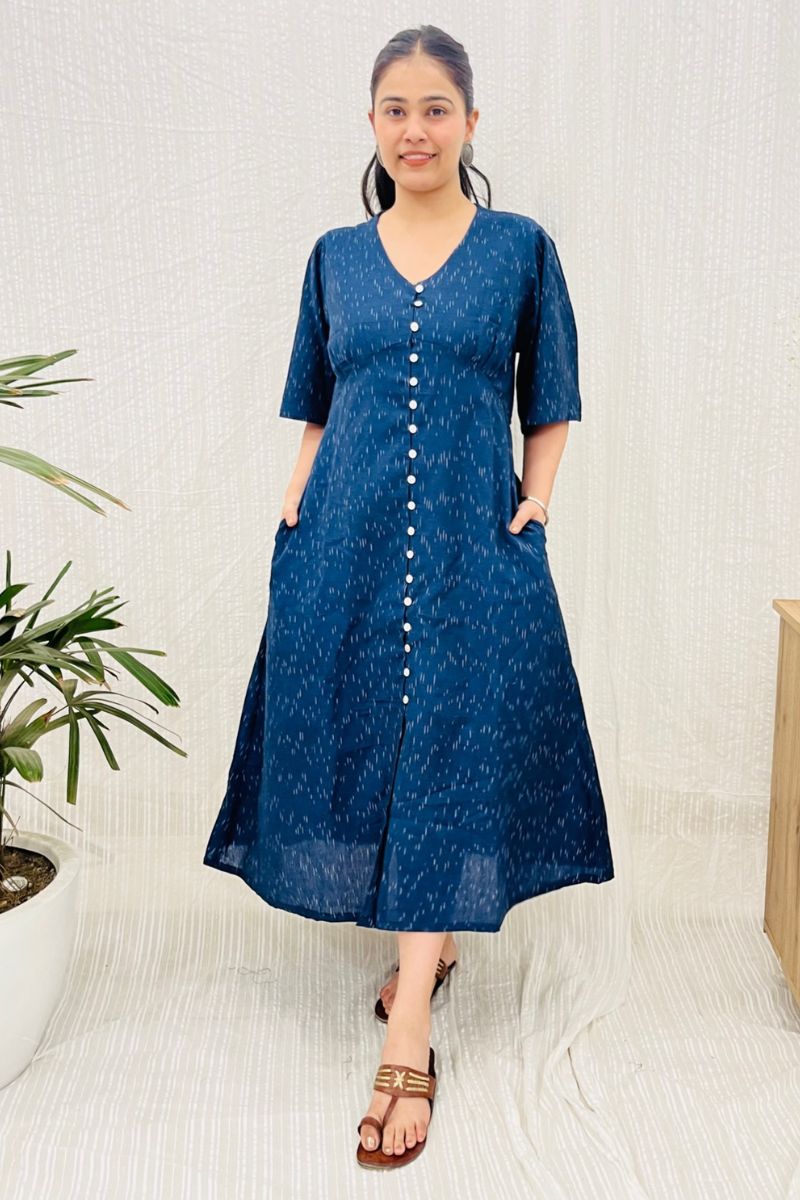 - Made in 100% cotton Ikat, this dress effortlessly combines comfort, elegance, and versatility, making it a must-have addition to your wardrobe for any occasion.