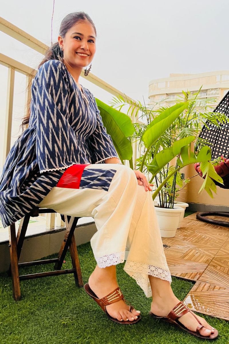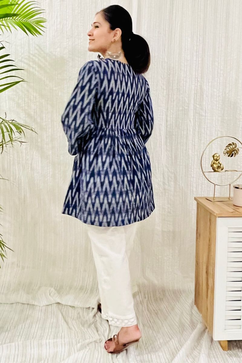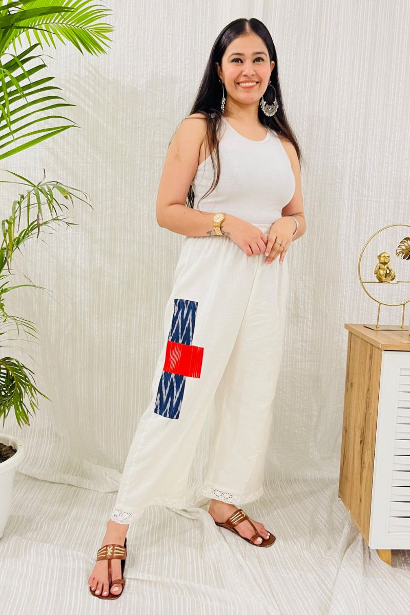 • Discover sophistication with our Navy Ikat Co-ord Set. Immerse yourself in the captivating charm of this shade of navy, paired with off-white pants with delicate ikat patch-work detail.