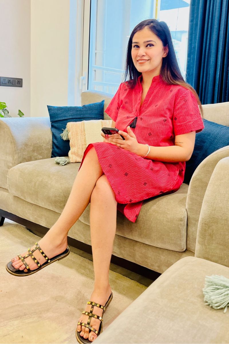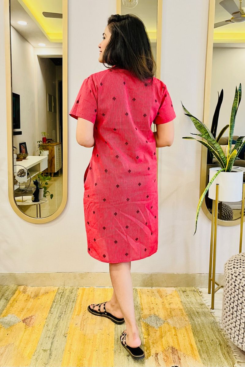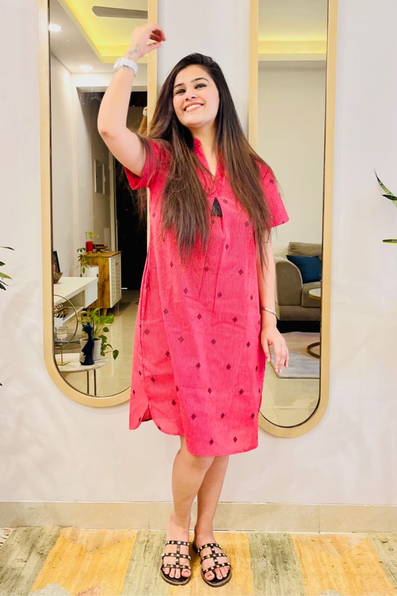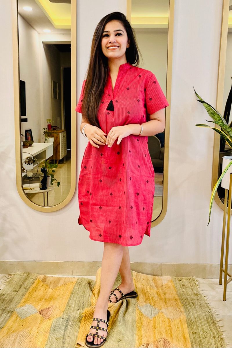 - Cut in self design cotton, this knee length dress can take you from a regular work day to a day out with family.