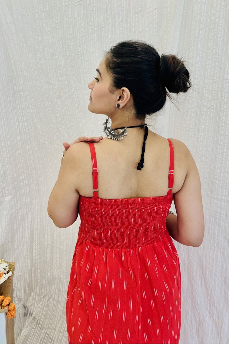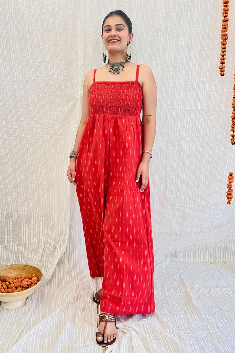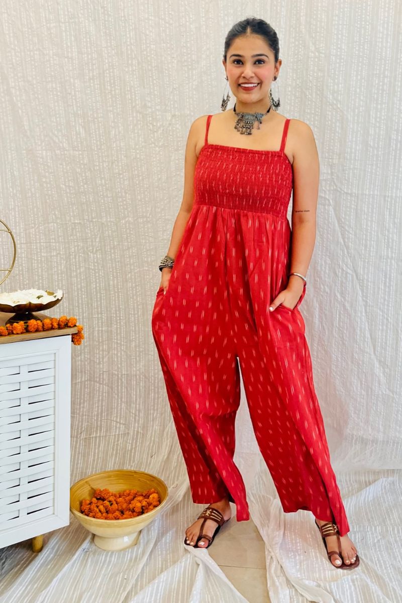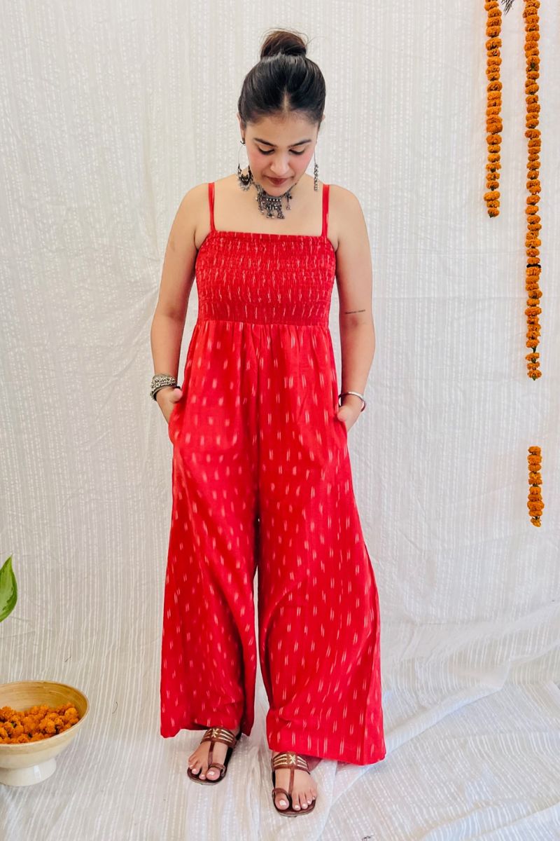 • The enchanting allure of our Red Ikat Jumpsuit is designed to captivate with its charm.