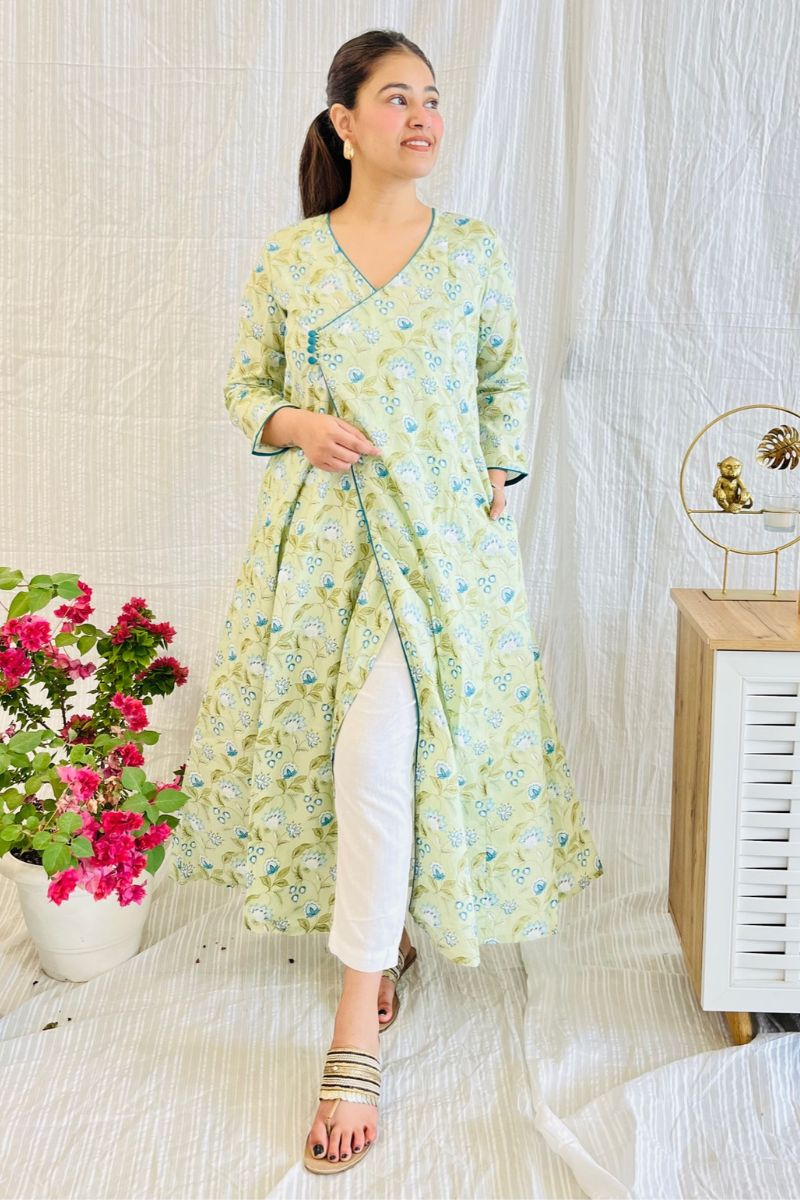 Sage Green Block Print Angrakha Kurta