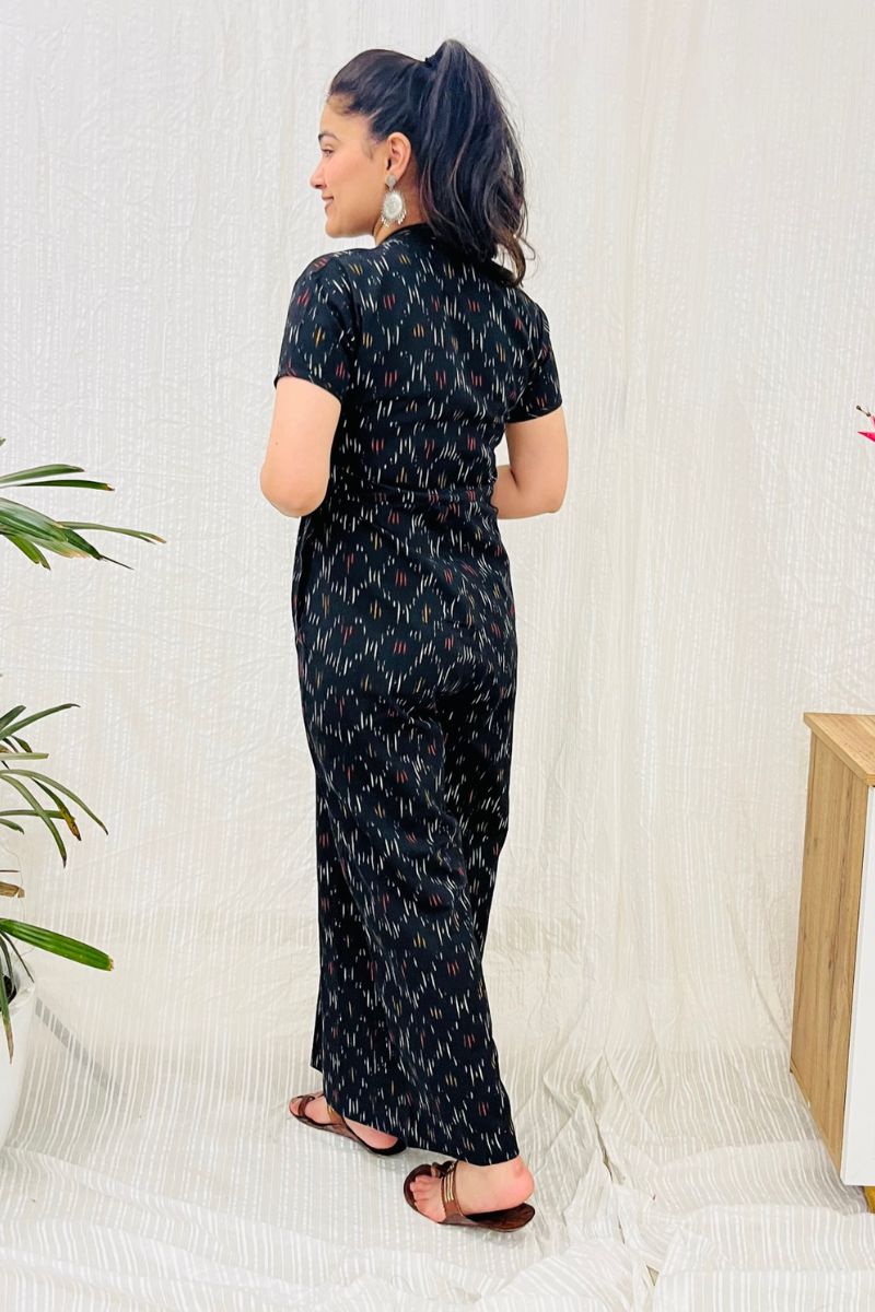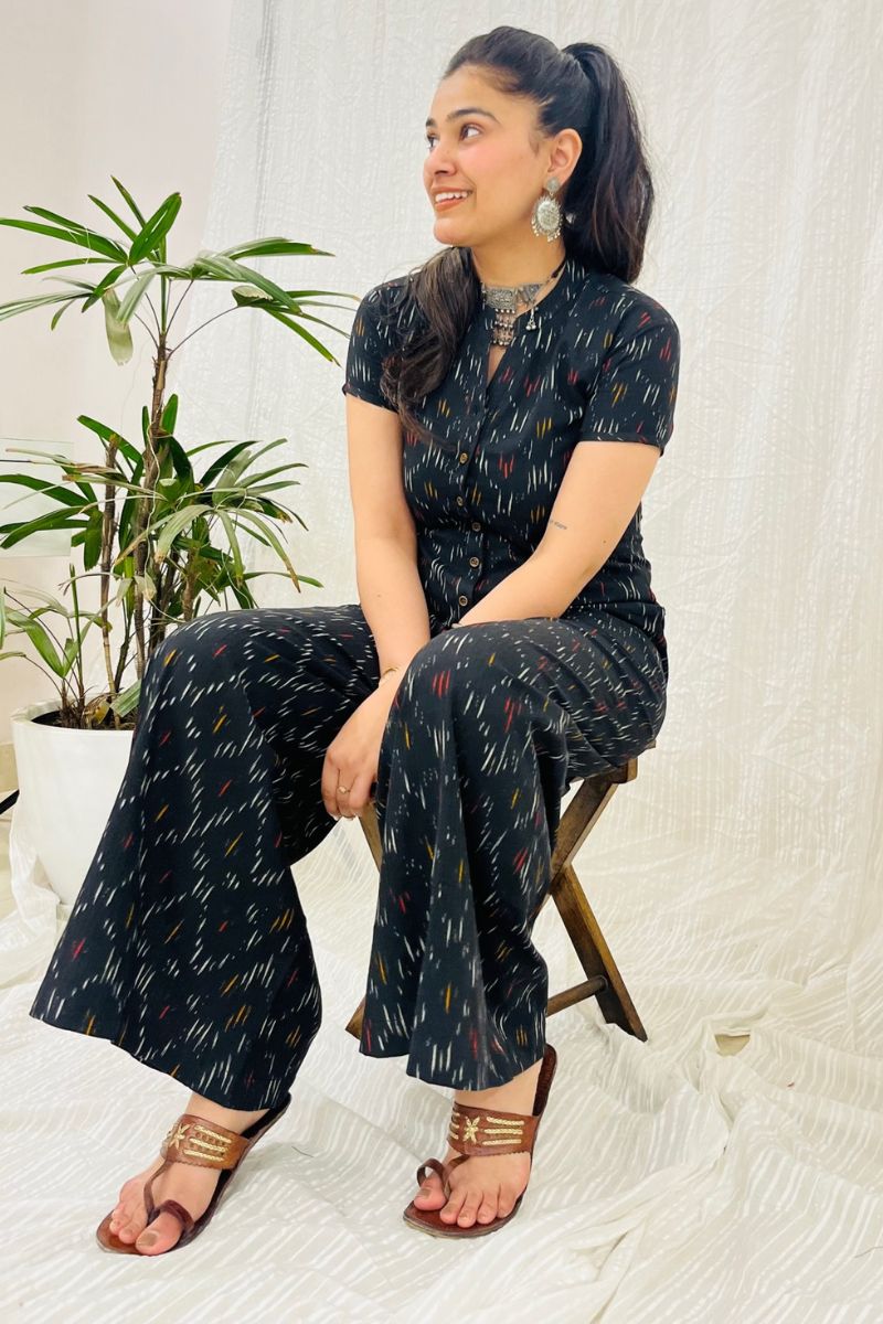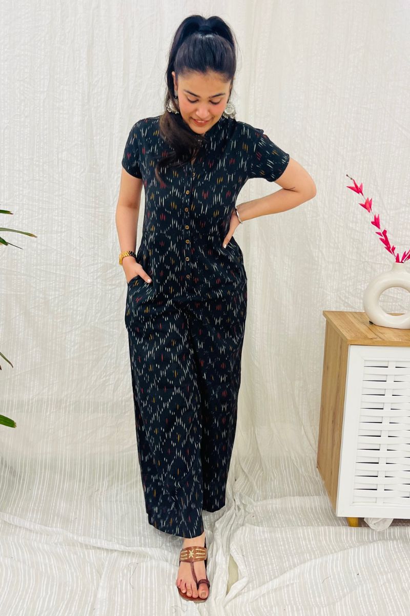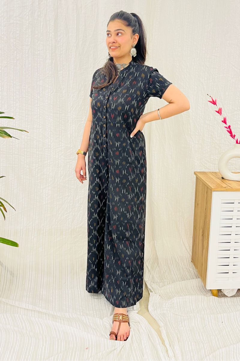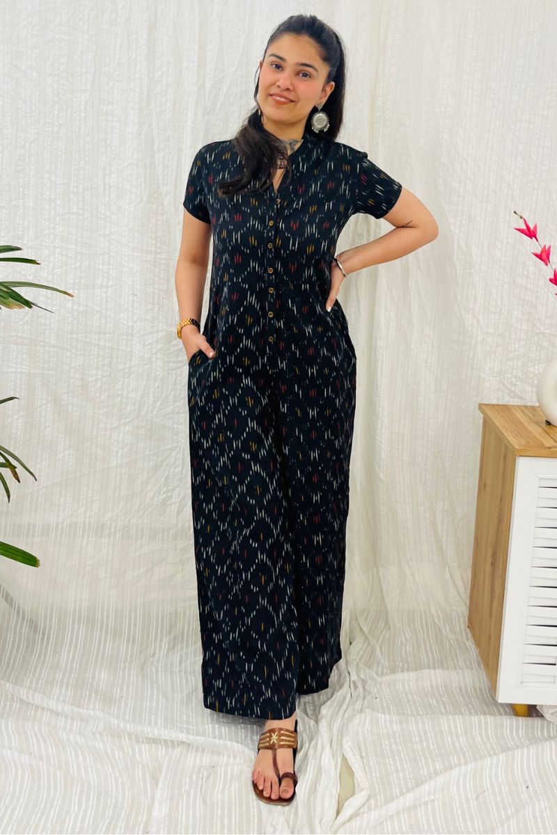 - Crafted in 100% cotton Ikat, sleeveless with high round neck. Like all our dresses, this jumpsuit too comes with pockets.