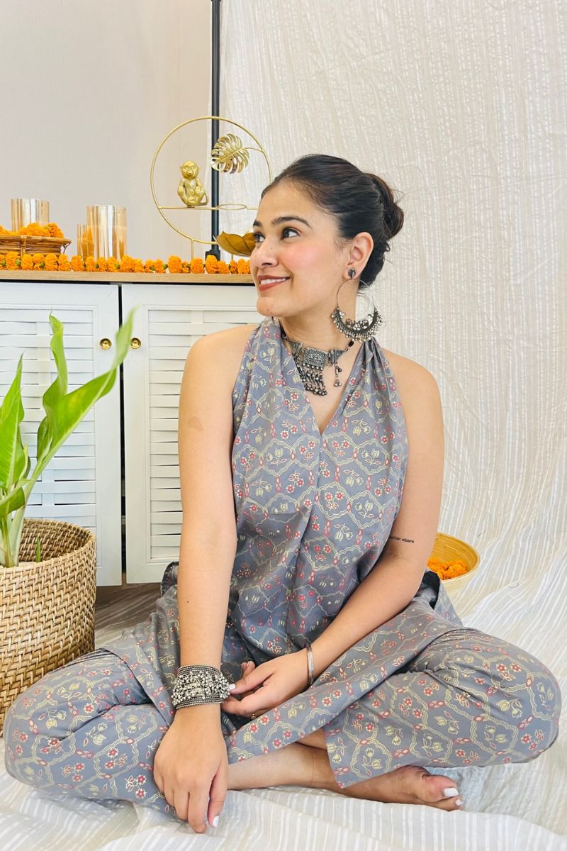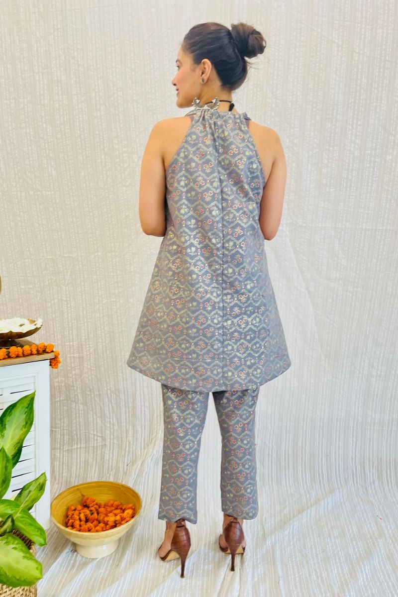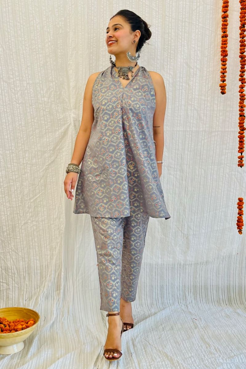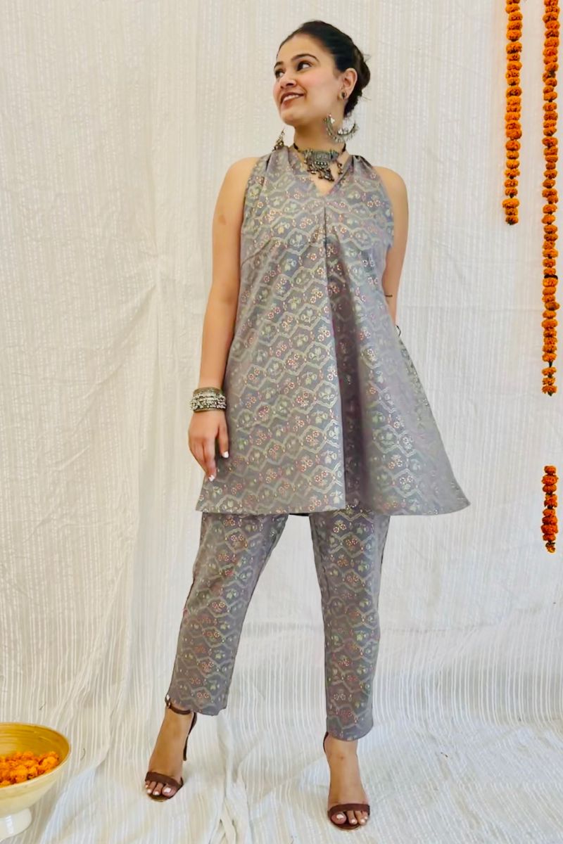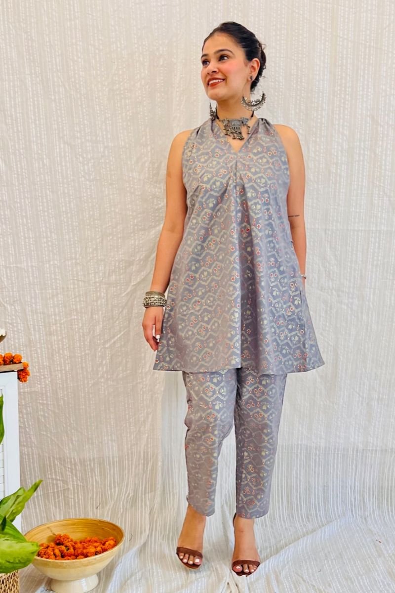 - Discover sophistication with our Grey Melange Co-ord Set. Indulge in the captivating charm of grey block print with gold detail.