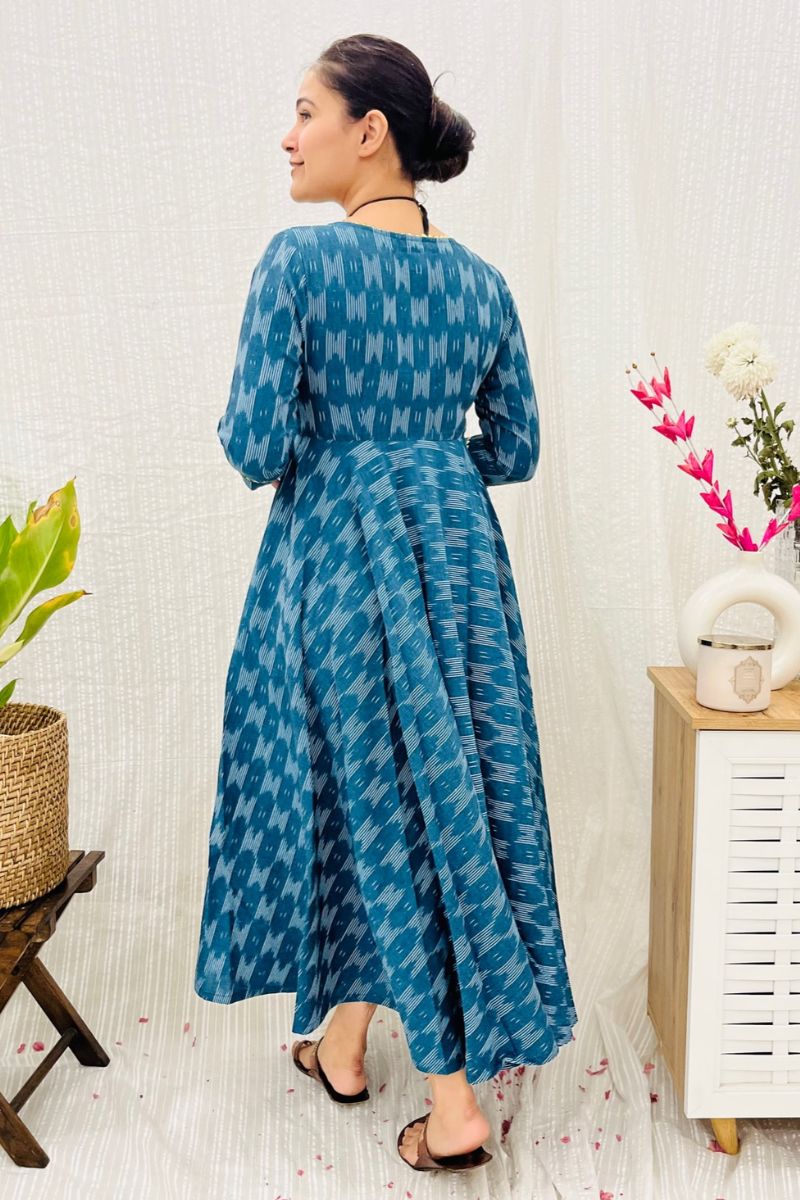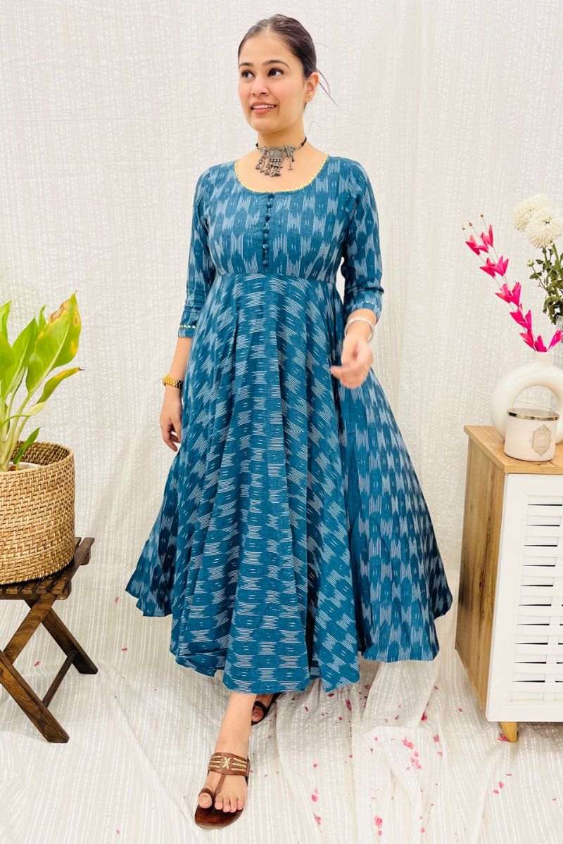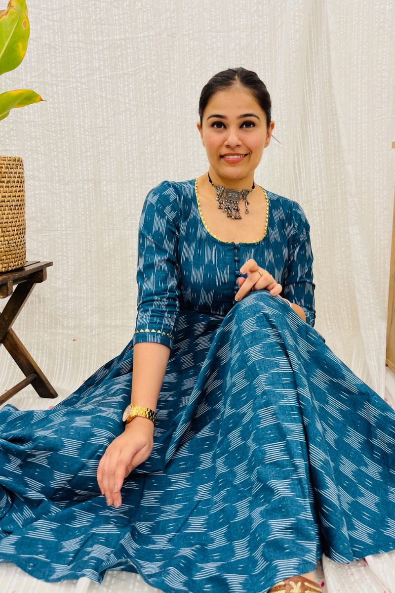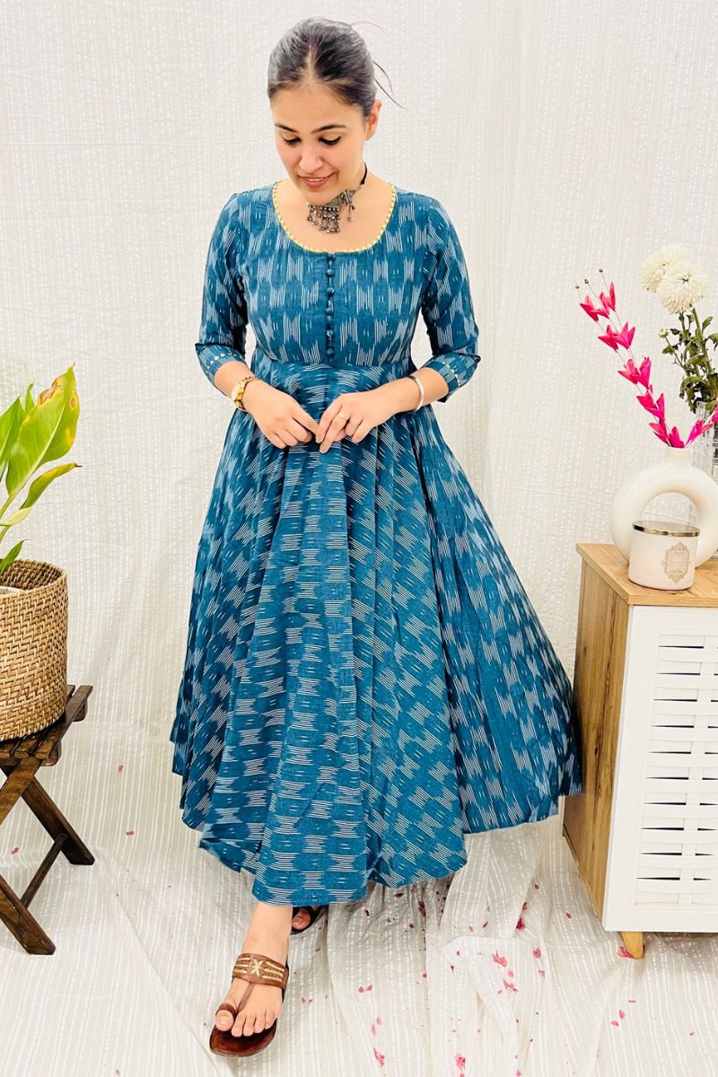 - Crafted in 100% cotton ikat fabric, the dress has a round neck with gota detailing and fabric buttons on the yoke.