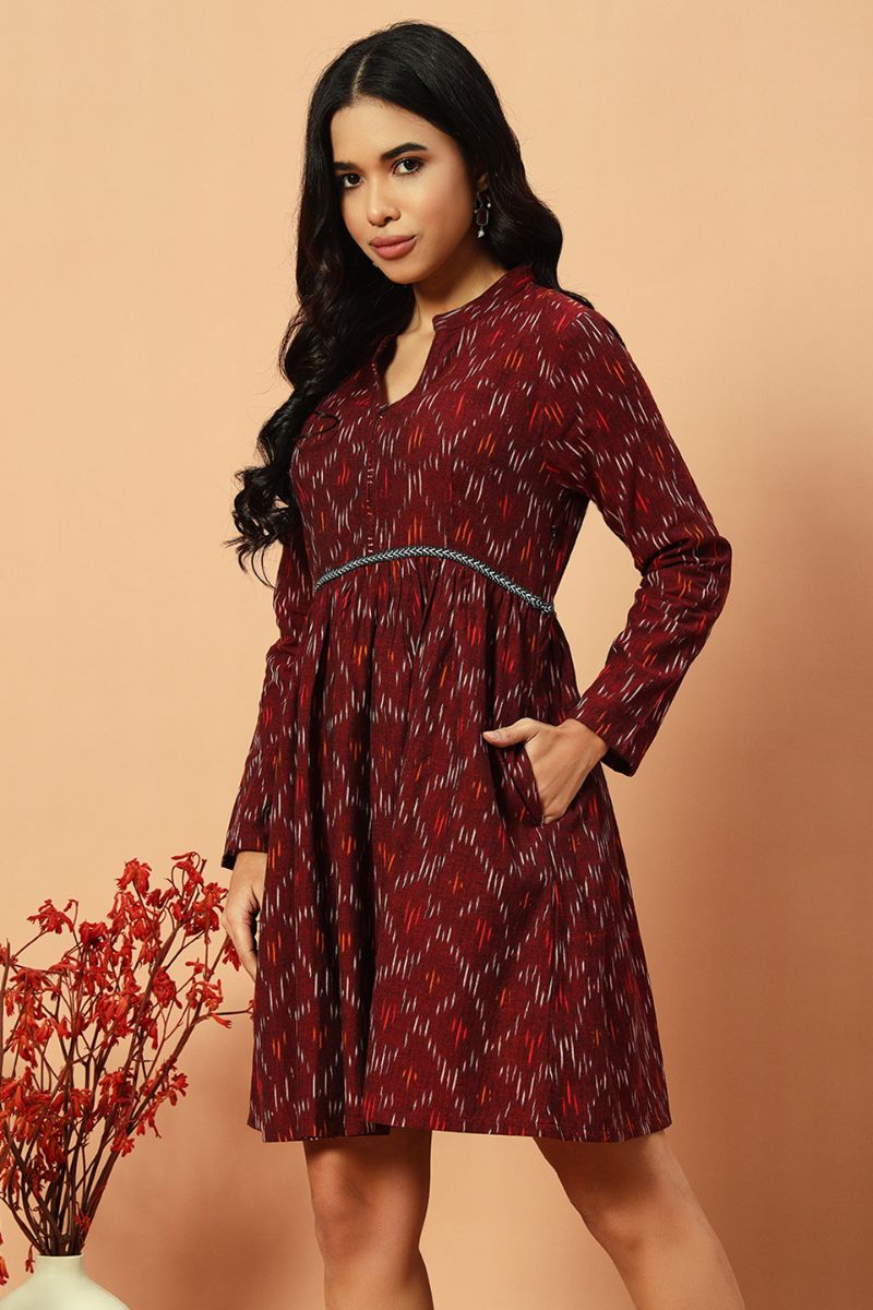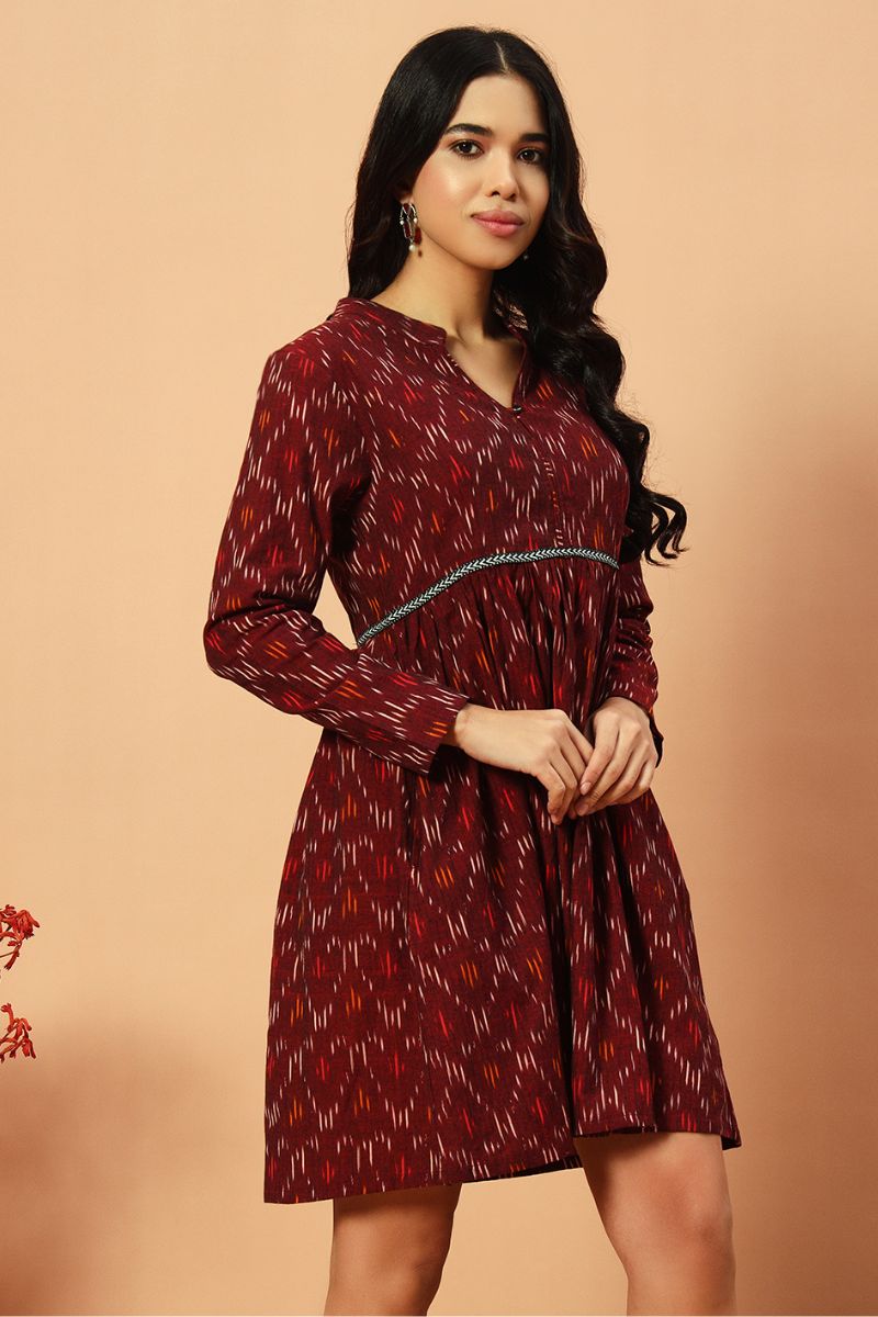 - Crafted in 100% cotton, the dress comes with mandarin collar with a V, 3/4th sleeves and a cute flare grazing the knees!